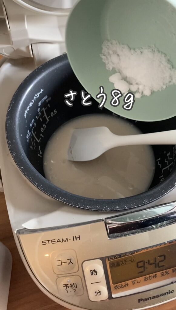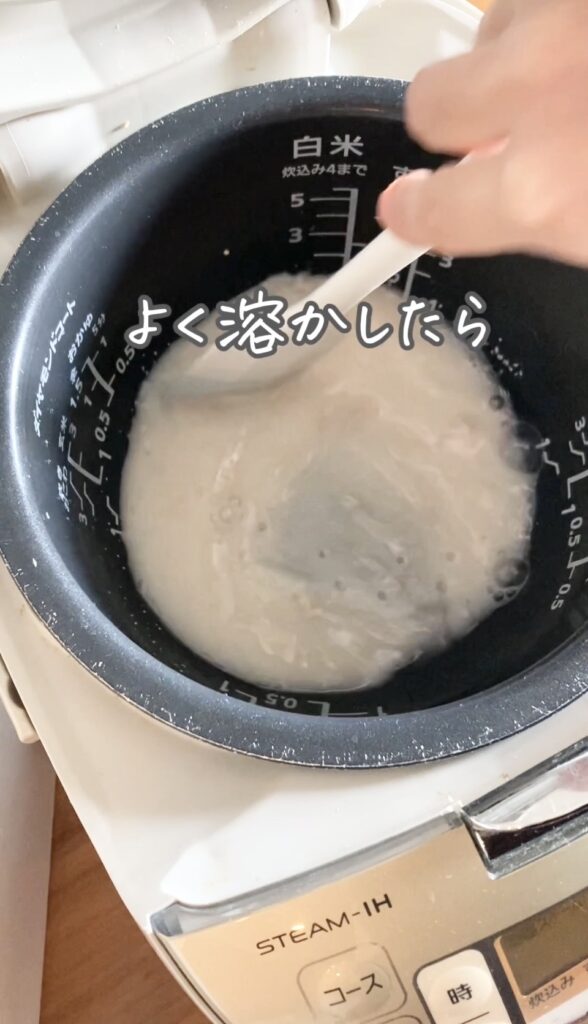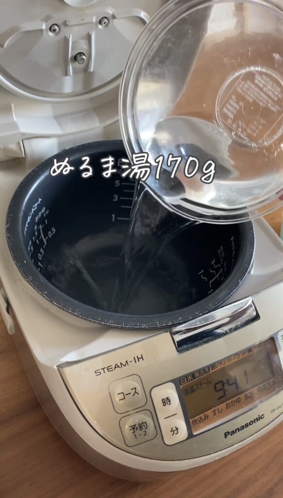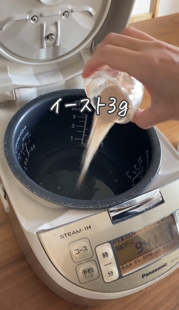 炊飯器の内釜にぬるま湯を入れ、イーストを加えてよく溶かします。