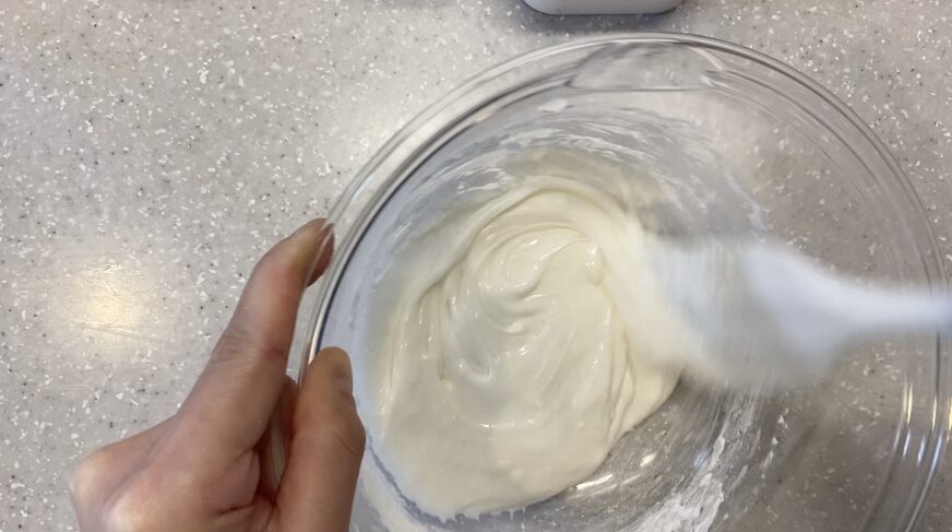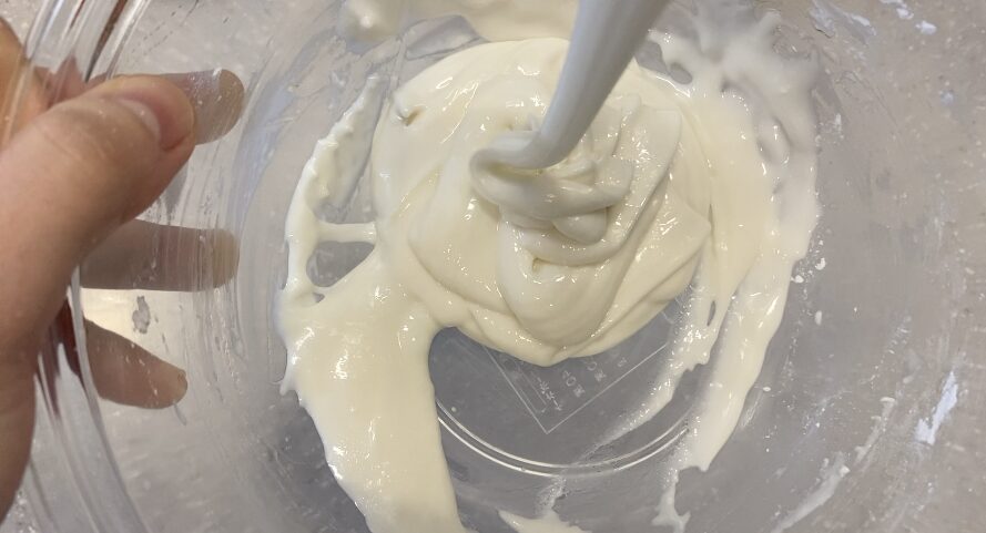 10秒素早く混ぜたら、また生地をすくって落とす。生地感を写真の様子まで近づけるよ
