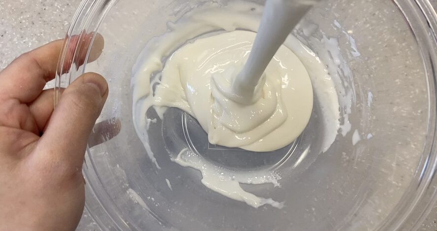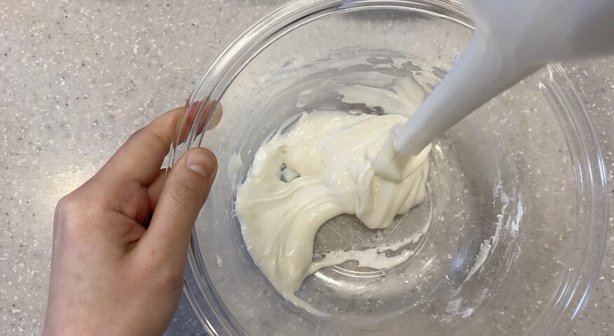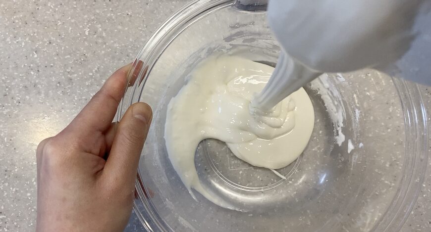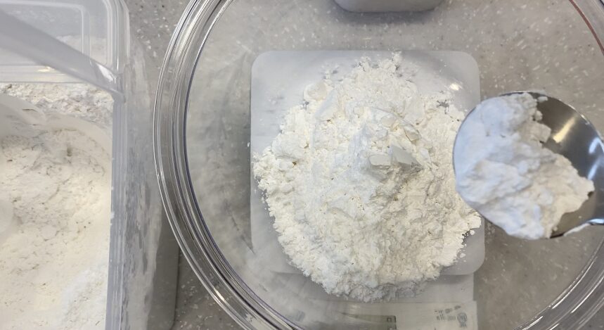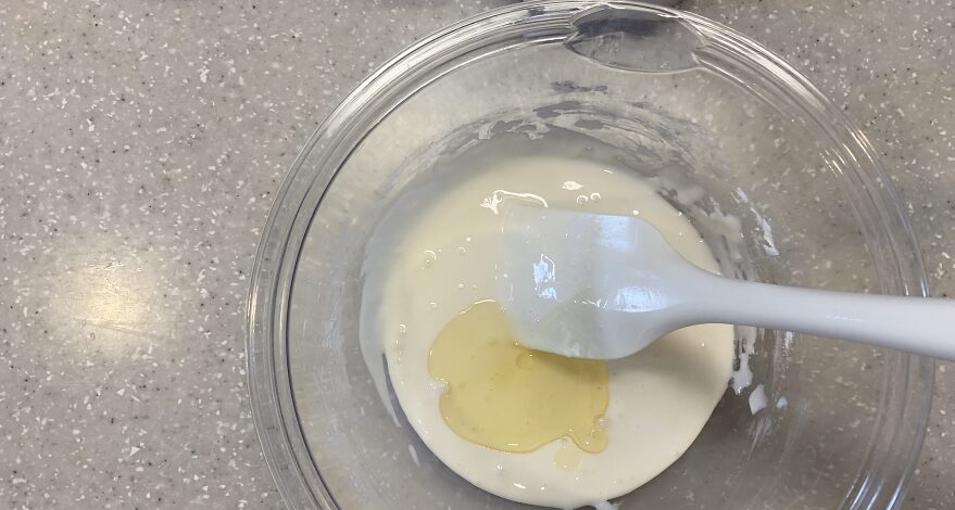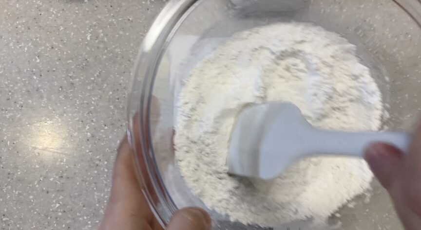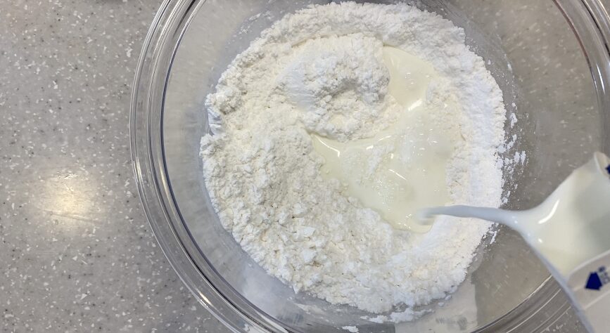ベーキングパウダーを全体に行きわたらないと、蒸しパンが綺麗に膨らまないよ。絶対粉類を計量したらヘラで混ぜておこう!