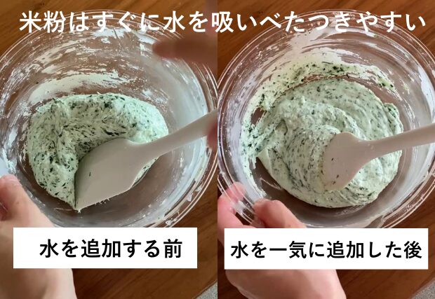 その分、水分量の調整もデリケートで少量の水をいれるだけでゆるくなりやすい。一方、粉がやや粗い米粉は、扱いやすい反面、