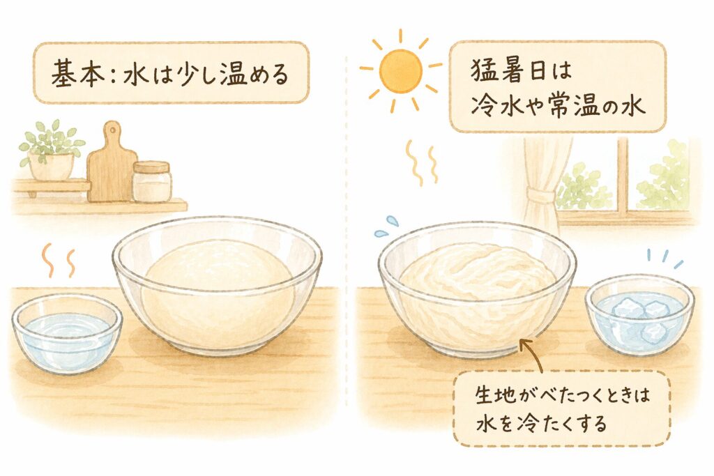 水の分量冷たい水(約5℃)から常温の水(約20℃)から