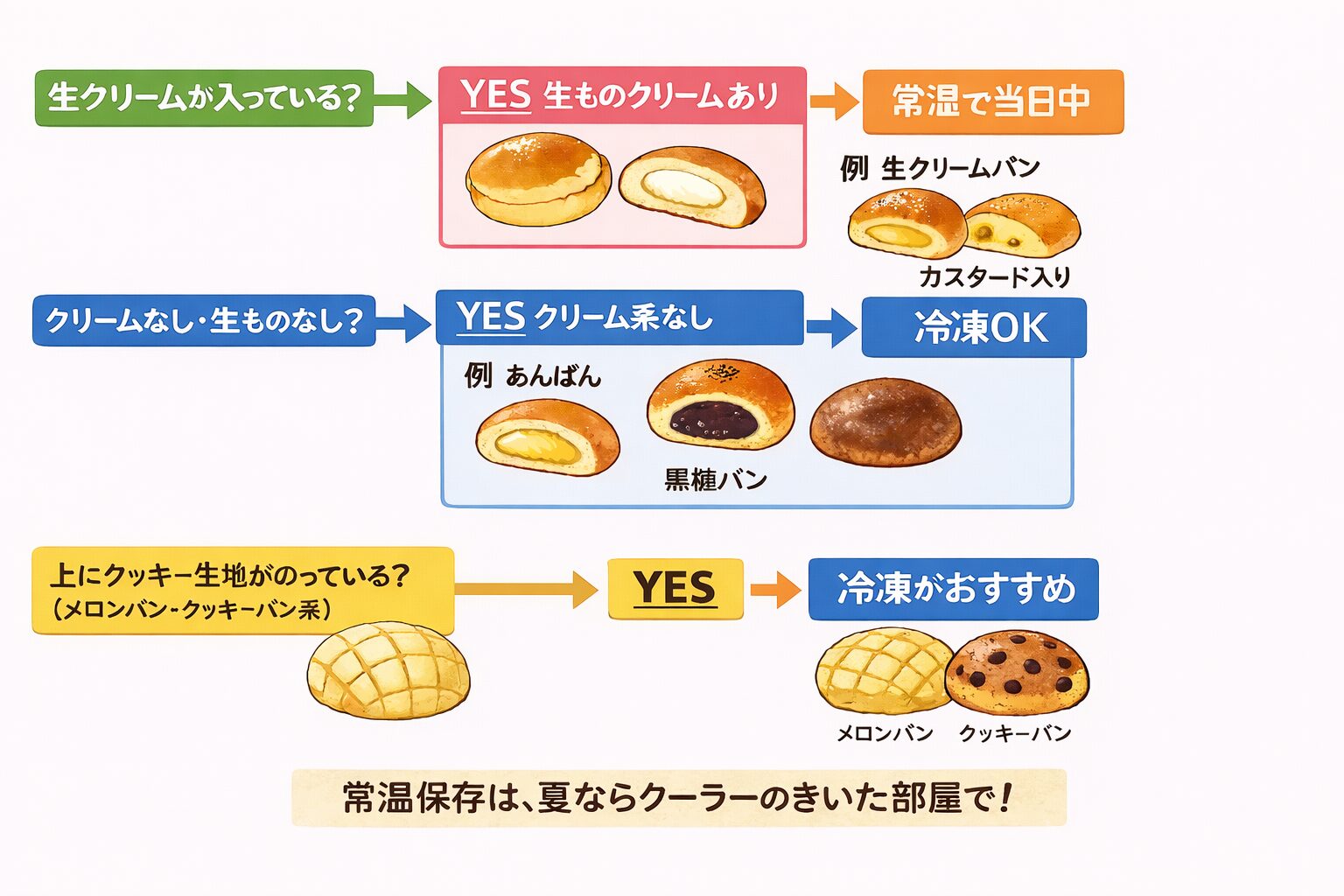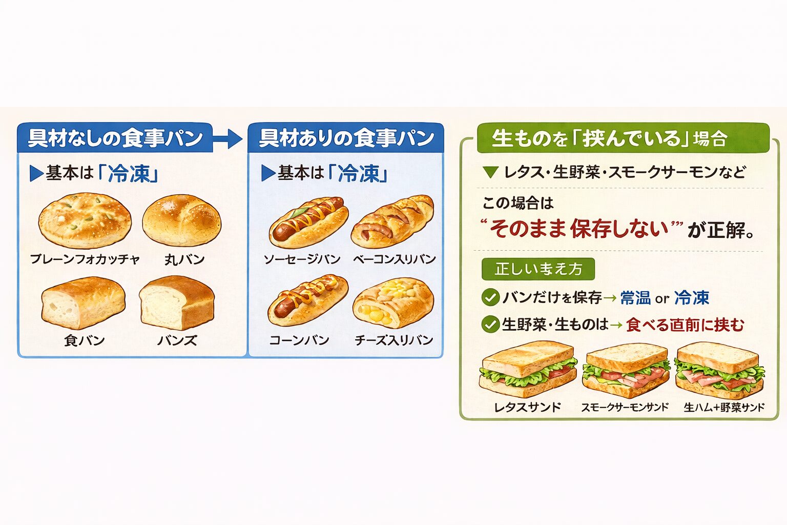 | あんぱん | 常温(当日)/冷凍 | 甘みと油分があり劣化が比較的ゆるやか |