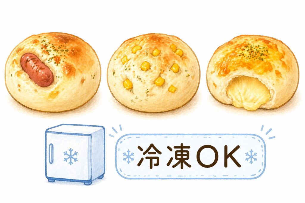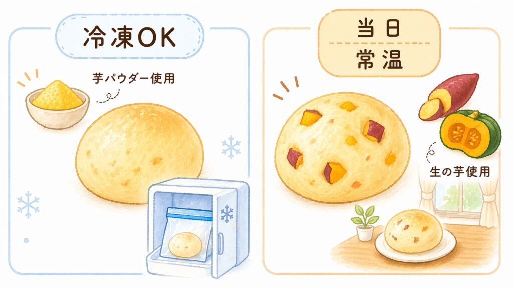 | さつまいもパン | 常温(当日)/冷凍 | パウダー使用なら冷凍もOK、生さつまいも使用なら当日食べ切るがおすすめ |