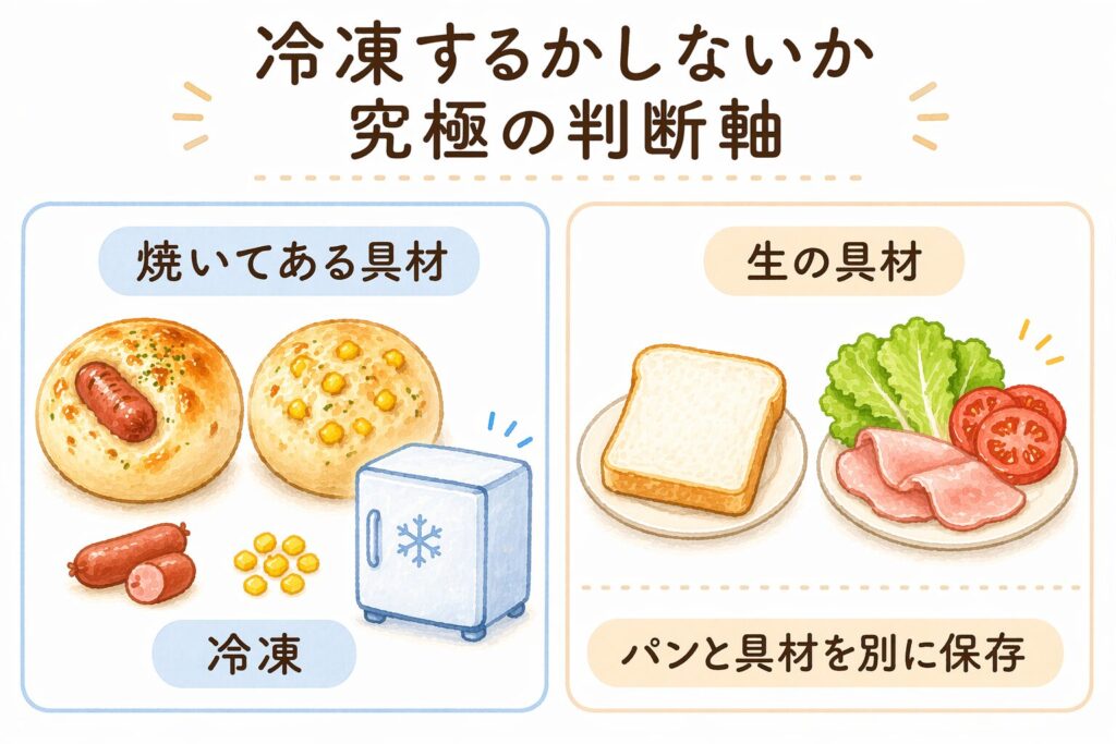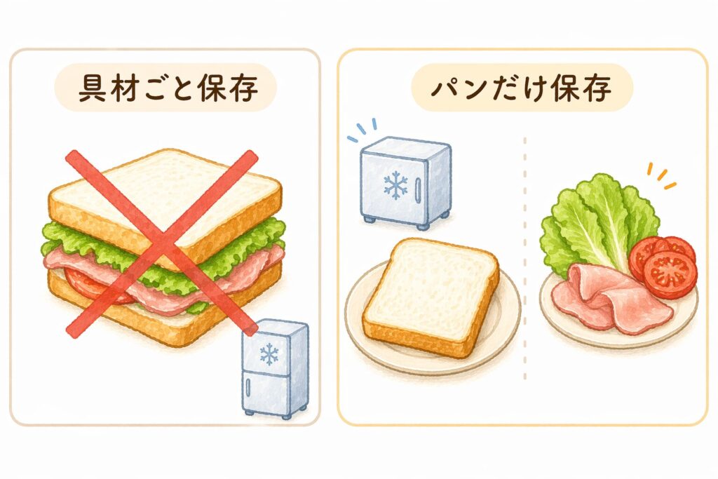 | 生ものを挟んでいる | パンのみ保存 | 生ものは後入れ |