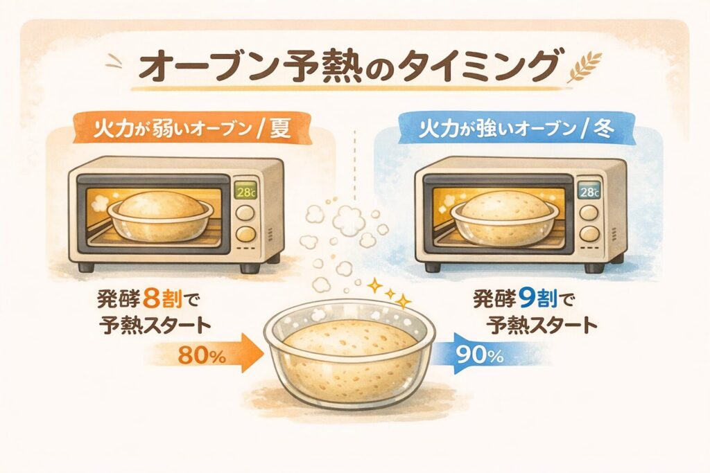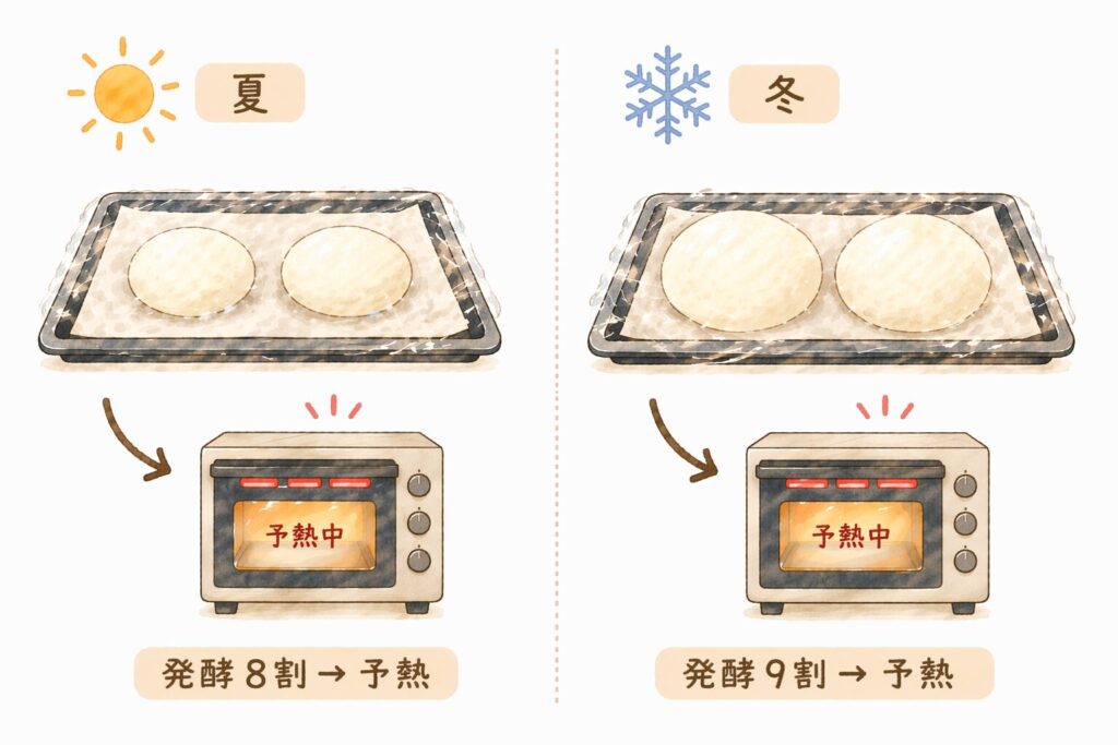 | 夏 | 発酵が8割終わった時 | 室温が高く、予熱中も発酵が一気に進みやすい |