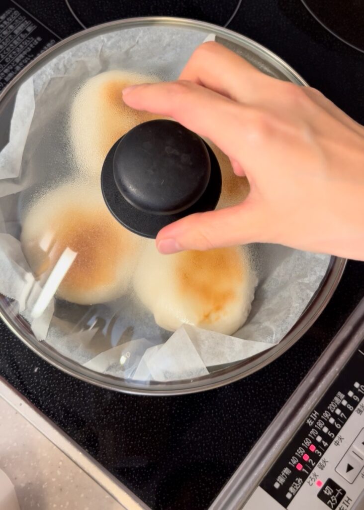 蓋はずっとつけたまま焼きます